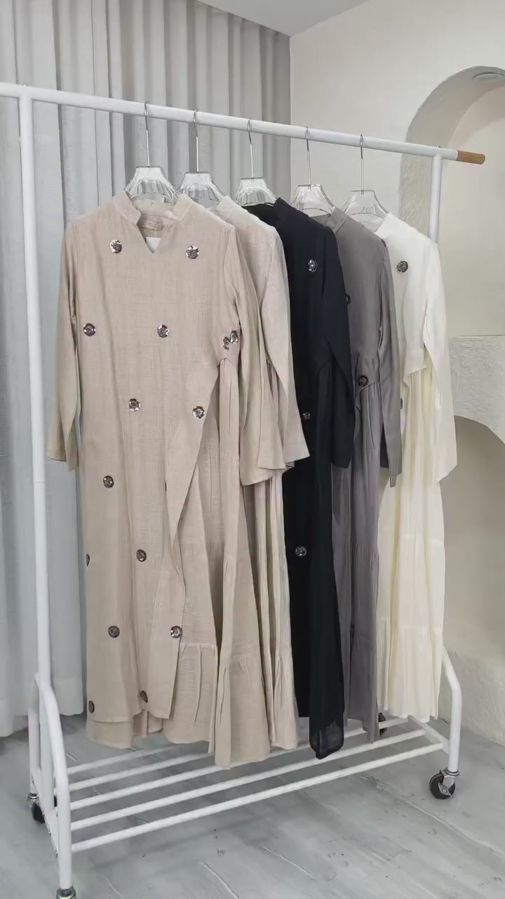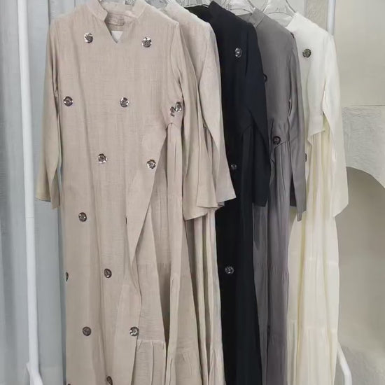 The design is defined by its unique asymmetrical wrap bodice, which gracefully leads to a voluminous tiered maxi skirt for exceptional movement and drape. Subtle, yet intricate, sequin-embroidery (or button-embroidery depending on the material) adds a touch of artisanal detail across the chest and sleeves. Finished with a modest high-mandarin neckline and full-length sleeves, this dress offers both coverage and sophisticated style. Available in a versatile palette of neutrals like Oatmeal, Black, Grey, and White.