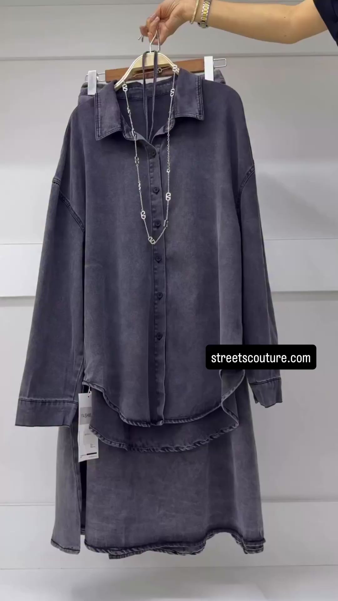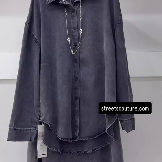The Shirt: An ultra-oversized hi-low button-down top with a relaxed, drop-shoulder fit. The raw-edge detailing and sweeping curved hem make it a perfect statement piece worn buttoned up, or as a jacket over a simple crop.