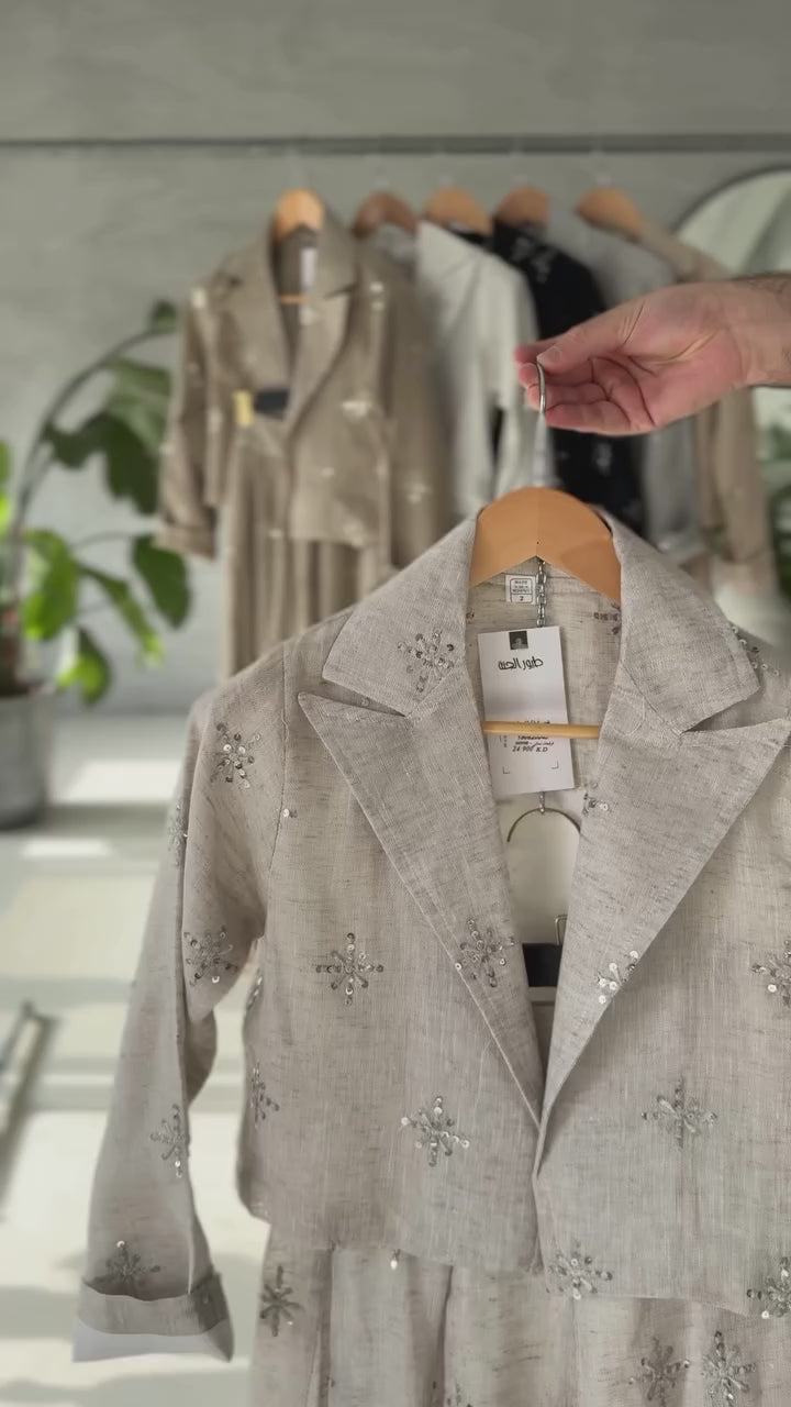 Introducing the Twilight Sparkle Co-ord Set, your new go-to for every special occasion. This two-piece stunner features a structured cropped blazer with an elegant shawl collar and a sweeping, fluid midi-skirt, both adorned with delicate, light-catching silver gold embellishments. It’s the perfect blend of modern tailoring and timeless sparkle. Stop searching for the perfect outfit—you just found it.